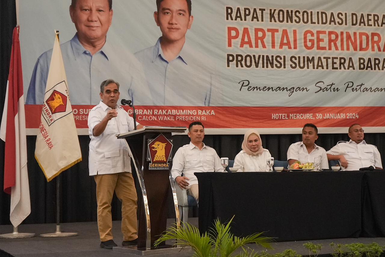 Sekjen Partai Gerindra Ahmad Muzani menghadiri konsolidasi Pemenangan Satu Putaran bersama kader Gerindra Sumatera Barat pada Selasa (30/1). Dalam sambutannya, Muzani menegaskan bahwa Sumatera Barat masih menjadi kandang atau basis pemilih Prabowo di Pilpres 2024.